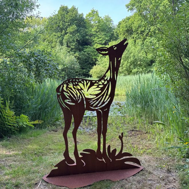 Niet lang geleden zagen we in het bos waar ik woon regelmatig reeën. Zo’n mooi gezicht: die ranke en toch gespierde dieren, de grote ogen, schuw en trots. Dat krachtige en tegelijk aaibare vind je terug in het silhouet van dit ontwerp. Ze eten alleen maar planten: de bloem- en bladvormen die uit het staal gesneden zijn.