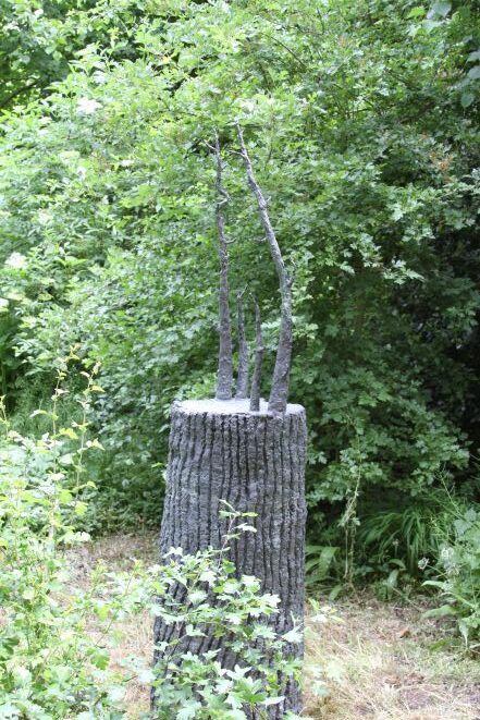 De kracht van de natuur is groot – deze omgezaagde boomstam groeit gewoon door. Als je goed kijkt, zie je dat er een bosnimf in de uitlopers verstopt zit. Ze is altijd aanwezig, maar alleen vanuit een bepaald standpunt zichtbaar. Zij is ons geweten en spoort ons aan goed voor de natuur te zorgen.