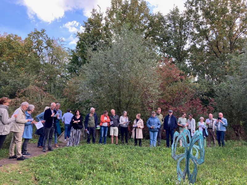 Vele belangstellenden genoten tijdens de Kunstroute Leiden van de kunst in de Heemtuin. Er waren rondleidingen en op zondagmiddag droegen Joke Schrijvers, Frans Terken en Wijnand Noot gedichten voor die zij afgelopen zomer speciaal bij een aantal beelden hebben gemaakt. Er werden ook gedichten voorgelezen van Mieke van den Berg.